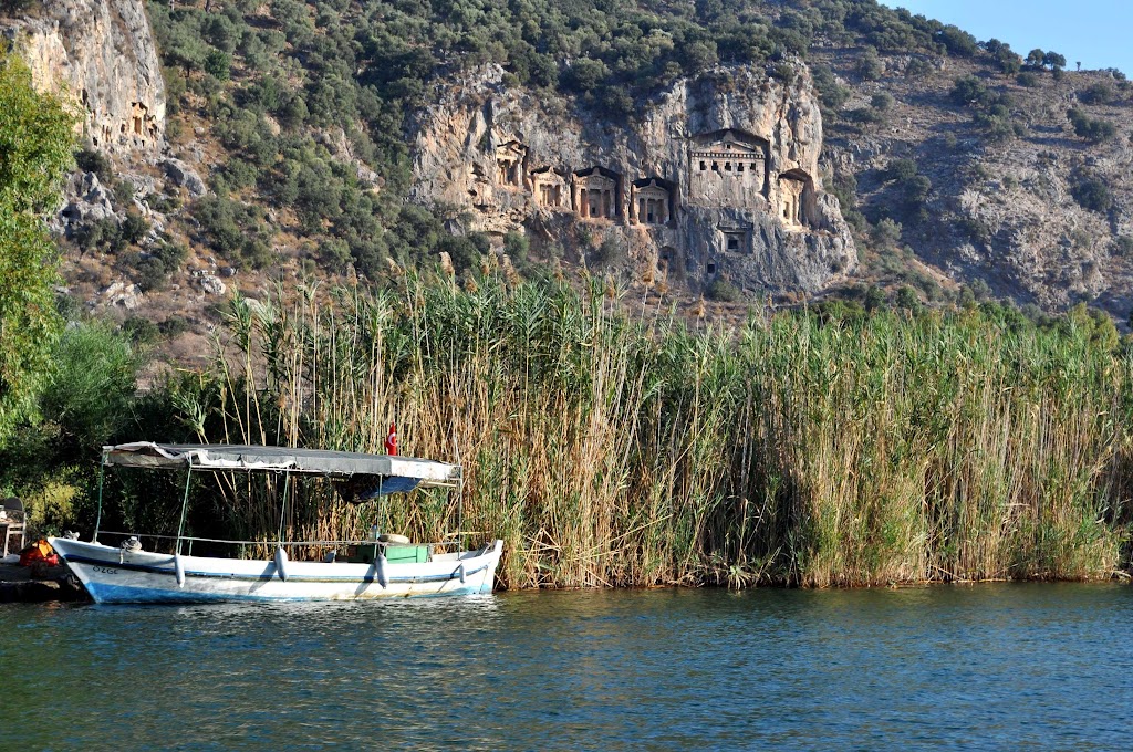 In the morning, we hired a piloted River boat to take us up the Dalyan River to ancient Caunos. You can read about Caunos in Herodotus's History, a city-state and maritime power. We first went up the Dalyan past Caunos and saw Dramatic rock tombs before hiking through ancient Caunos.