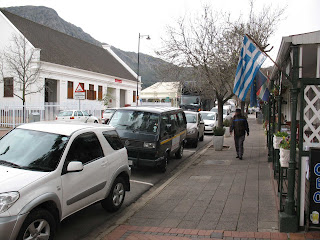 As we entered Stellenbosch we noticed the fuel gage on our car was below empty. We all know wine is a fuel, but not for our little car, so the search for a petrol station was on. After we fueled the car we forgot all about our search for the perfect wine and headed for Franschhoek as it was getting close to lunch time and we had been given some restaurant recommendations in Franschhoek. It was beautiful drive from Stellenbosch to Franschhoek. The village of Franschhoek is cute with many restaurants and craft shops. We had a very nice meal at Rueben's.