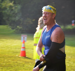 If I could only walk! I hobbled to the transition area about 200 meters from the lake. Klark Kent was just finishing up his transition, he beat me out of the water by just under a minute, with a time of 47:22. Here are the Swim stats. Laine - 33:09 first women out of the water. Crazy Christine 38:32 first time she ever did an open water swim, like I said "CRAZY". Lorenzo 42:21 he just did an Ironman a few weeks before.