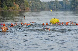 As the men's start, got close I realized I should be about the same speed as Klark Kent. The gun went off, we headed toward the first yellow buoy. Both Klark Kent and I realized the lake was shallow enough to touch bottom so we ran as far as we could until we were forced to swim. Marking the course were orange sighting buoys and