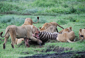 were quickly devouring the zebra. Clearly there was a hierarchy to the pecking or should I say feeding order of the pride. The male was not present, so the adult females ate first with the cubs to follow. Once a particular lion was full it would walk away and fall asleep, allowing room for another to step in and start eating. Watching all this eating was making us hungry so we decided to head back to camp for some dinner.