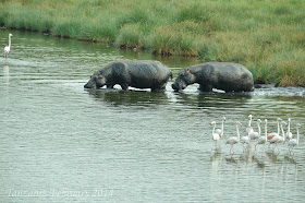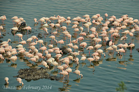 both Flamingoes and Pelicans. Kawaga is such a great guide he obliged and took us to the waters edge, which is the border between the Serengeti National Park and the Ngorongoro Conservation Area. Kawaga granted our wish. Feeding at the banks of the lake were pink flamingoes. Every so often one would stretch out it's wings to dry them in the sun, or a group would fly across the lake, what a great photo opportunity.