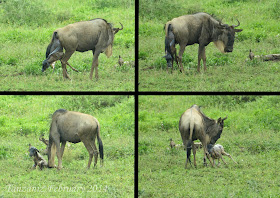 All of a sudden Margarite noticed a wildebeest cow giving birth, what a sight. Within minutes of the calf being born it was trying to stand, within a half hour it was walking, which quickly turned to running. What a great experience. Two days before we saw lions right after they had killed a wildebeest and today we saw a wildebeest being born. We continued our search for calves being born.