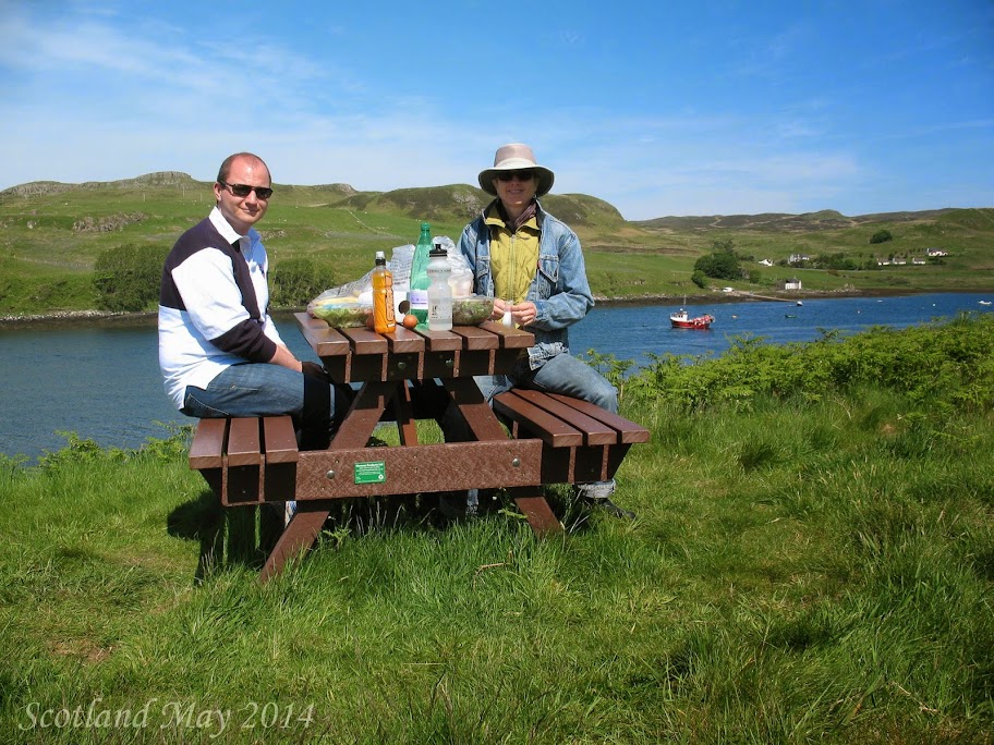 We decided we would be staying in Portree for only 2 nights. This gives us one full day to tour the Isle of Skye. We thought let's circumnavigate the island. Our first stop you got it! A distillery. Talisker, the only distillery on the Isle of Skye. After the distillery we continue our circumnavigation going clockwise around the Isle. The coast line was beautiful with amazing cliffs. The sky was clear and as blue as could be. From what we heard it was rare to have such a blue sky on Skye. We ended the day at Kilt Rock. Kilt rock is known for the water fall where the water appears to come right out of the cliffs edge and falls into the sea. Dinner that night was salad and smoked salmon bought at the local grocery.