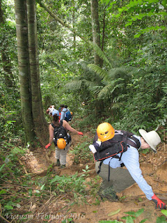 We climb the back side of Langbian Mountain to an elevation of about 1,750 meters. The trail winds, climbs, and falls. The trail was sometimes wide and sometimes single track, though always beautiful, views of the forested and stepped valleys. After about 20 kilometers we return to paved road.