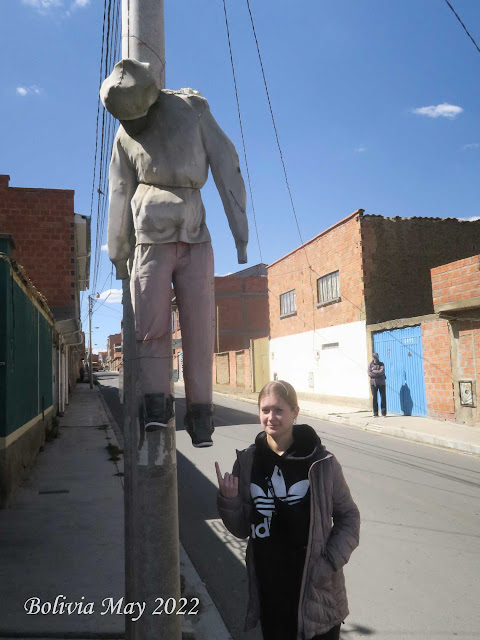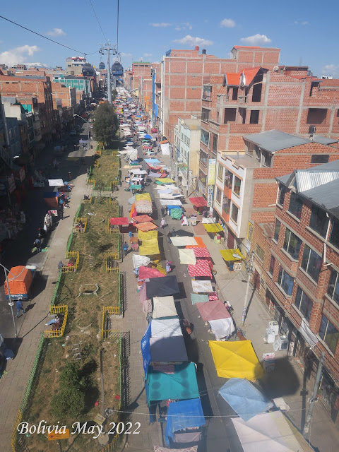 We are staying at the Ritz Apart Hotel. It is in a central location all the rooms are suites with a living room and kitchen and in our case two bedrooms. The service has been outstanding. The only downside is the restaurant is just ok. This morning we met Wence at 9:00 and started our tour by taking the blue line (Tram) up to El Alto. I am still in awe of this tram system. For about one U.S. dollar, you can get around La Paz with no hazel and beautiful views.