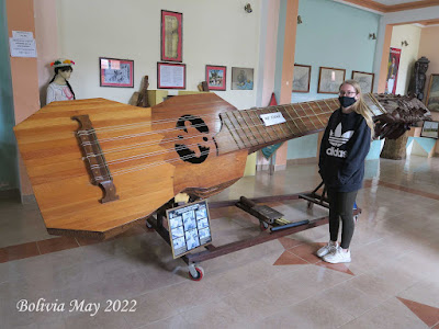 Today we will be driving eight hours (not including stops) to a village with a population of sixty people. The town is La Higuera, which is in the middle of nowhere. The majority of the drive was on dirt roads with steep drop-offs. And misstep, and you are two thousand feet off a cliff. We stopped in a little town, Serrano, for lunch. The town’s claim to fame is having the largest Charango in the world. The guitar-like instrument is played by six people and is recognized by the Guinness World Book of Records.