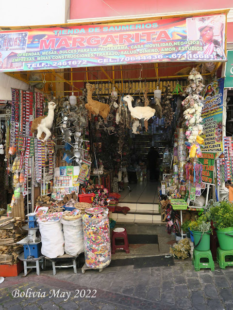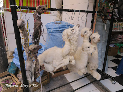 Next, we visited the witch's market. Here we saw many llama fetuses and baby llamas for sale. The fetuses are not taken from the mothers but saved and dried after a miscarriage. The baby llamas are llamas that did not survive.