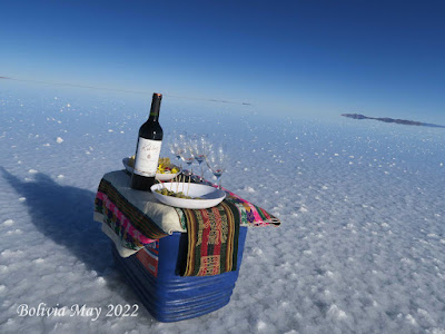 We got back in the 4x4 for another hour drive. Yes, the salt flats are vast. We came to an area that had about an inch of water. We took more pictures. Wence served us wine and snacks as we waited for the sun to set.