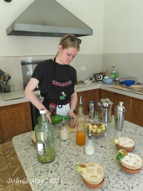 Next made a specialty cocktail that Moises created himself, which he used as part of his thesis at the University. This cocktail included six shots of alcohol. We would be drinking this with our meal. We assumed that this would ensure we enjoyed our meal even if we failed our cooking class. At this point, it was time to start cooking the main course. A Bolivian specialty of chicken cooked in pepper sauce.
