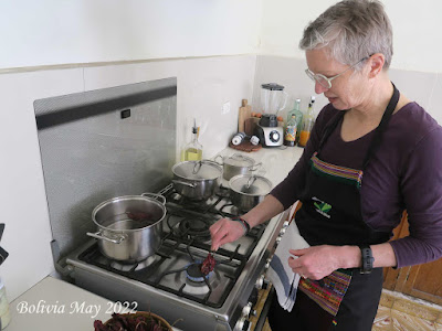 We first prepared the items that would go into the main dish, Potatoes (they eat a LOT of potatoes in Bolivia), onions, garlic, etc... Anything extra we put into a stock Moises was preparing. No waste in this kitchen.
