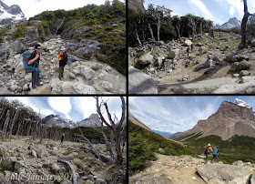 The trail started out flat, but changed quickly, and grew steep and gravely. We climbed about 300 meters in a kilometer and a half, reaching what they call the wind tunnel, a steep valley that normally has powerful winds. Today no winds! As we continued along the ridge of the valley the views were breath taking, looking down on the narrow river created from the melting glacier. As steep as the trail up was, it was just as steep down as we reached the Chilean Camp. We were about 4.5 kilometers into the hike. We took a short break allowing Thomas and the frat boys to catch up. Twenty five minutes later they joined us, immediately telling us they will be renting horses for the hike back.