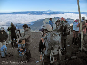 As we left Puncon the sky was covered with dense clouds, as the van started climbing in elevation we saw we were really in a fog and were quickly climbed above the fog. Looking back it was like a cotton blanket covering Puncon. When we arrived at the volcano, except a small cloud at the top of the volcano resembling and umbrella swirling in circles, the sky was as clear as could be. Based on the speed of the swirling cloud, there were high winds at the top of the volcano. The guides again gave us the option to cancel, again we all agreed to go on. We had a choice we could ride the ski lift about 25% of the way up or we could hike that 25%. The lift cost 9,000 pesos and would save us an hour of hiking, it was unanimous take the lift! The sky and scenery were beautiful. Looking back at Punco you could see the fog receding but still covering most of the town. Looking up at the summit the cloud was growing and spinning even faster meaning