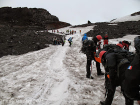volcano again we quickly passed the other groups as they were slipping and sliding without crampons. The wind was blowing between 40 and 50 miles per hour. We continued up the volcano. Our guides kept us close together, visibility was down to a few feet. Again one of the guides went ahead to scout things out.