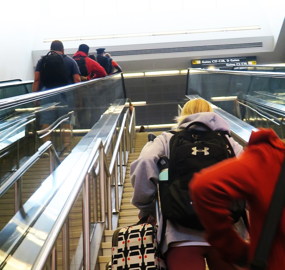 The Airport; more crowded than expected for a Saturday morning during a pandemic. Everybody is being generous in their social distancing. The one observation that I found curious was the escalators. We are flying out of Dulles Airport, just outside Washington D.C. anytime you need to go up or down a floor, there are escalators with stairs next to them. Throughout the airport, people stayed at least six feet apart. On the escalators, it was different. People crammed up against each other. It seemed as if when they got on the escalator, the pandemic, ended and then when they got off, they spaced out again as if they realized the pandemic was still with us.