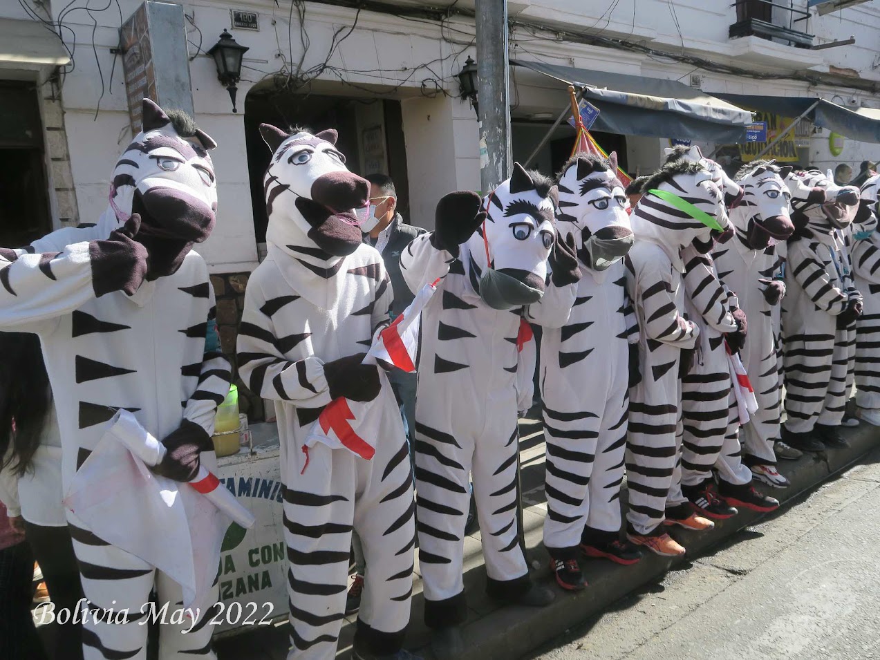 We left the market and ran into the Independence Day parade. The streets were crowded with both marchers and spectators. It was much like any other Independence Day parade. One exception a group of spectators dressed as zebras. Elvis gave us an explanation for the zebras, but we did not retain it, as it did not make any sense.