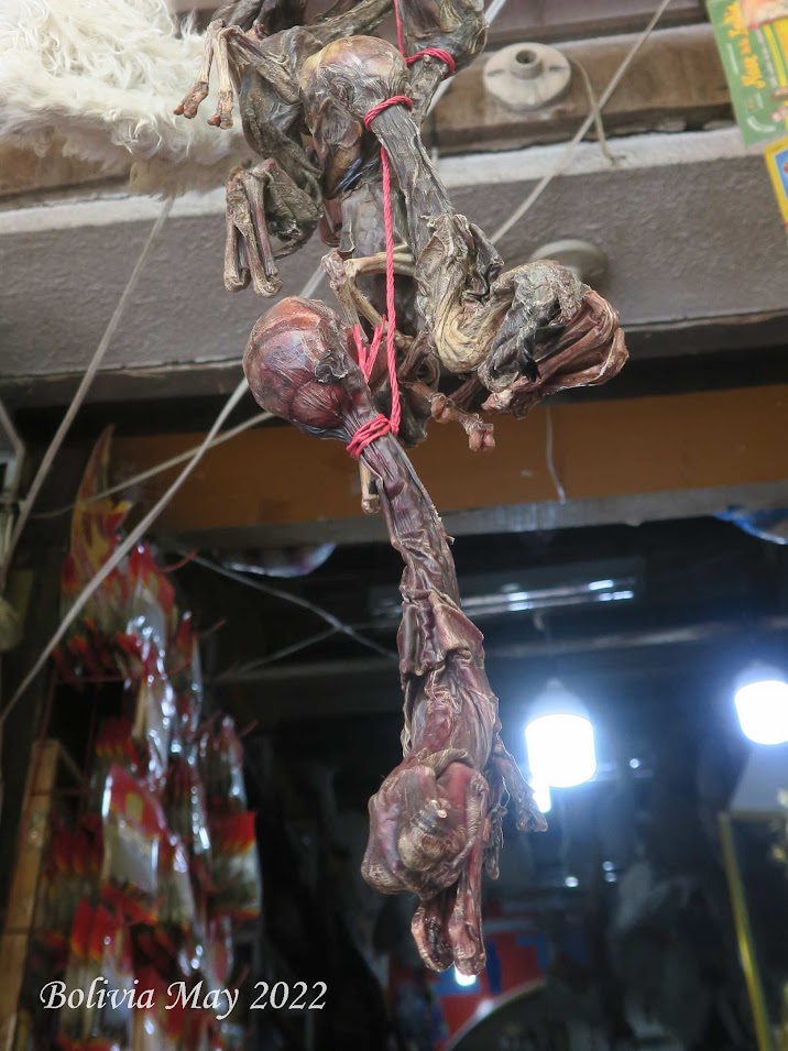 Next, we visited the witch's market. Here we saw many llama fetuses and baby llamas for sale. The fetuses are not taken from the mothers but saved and dried after a miscarriage. The baby llamas are llamas that did not survive.