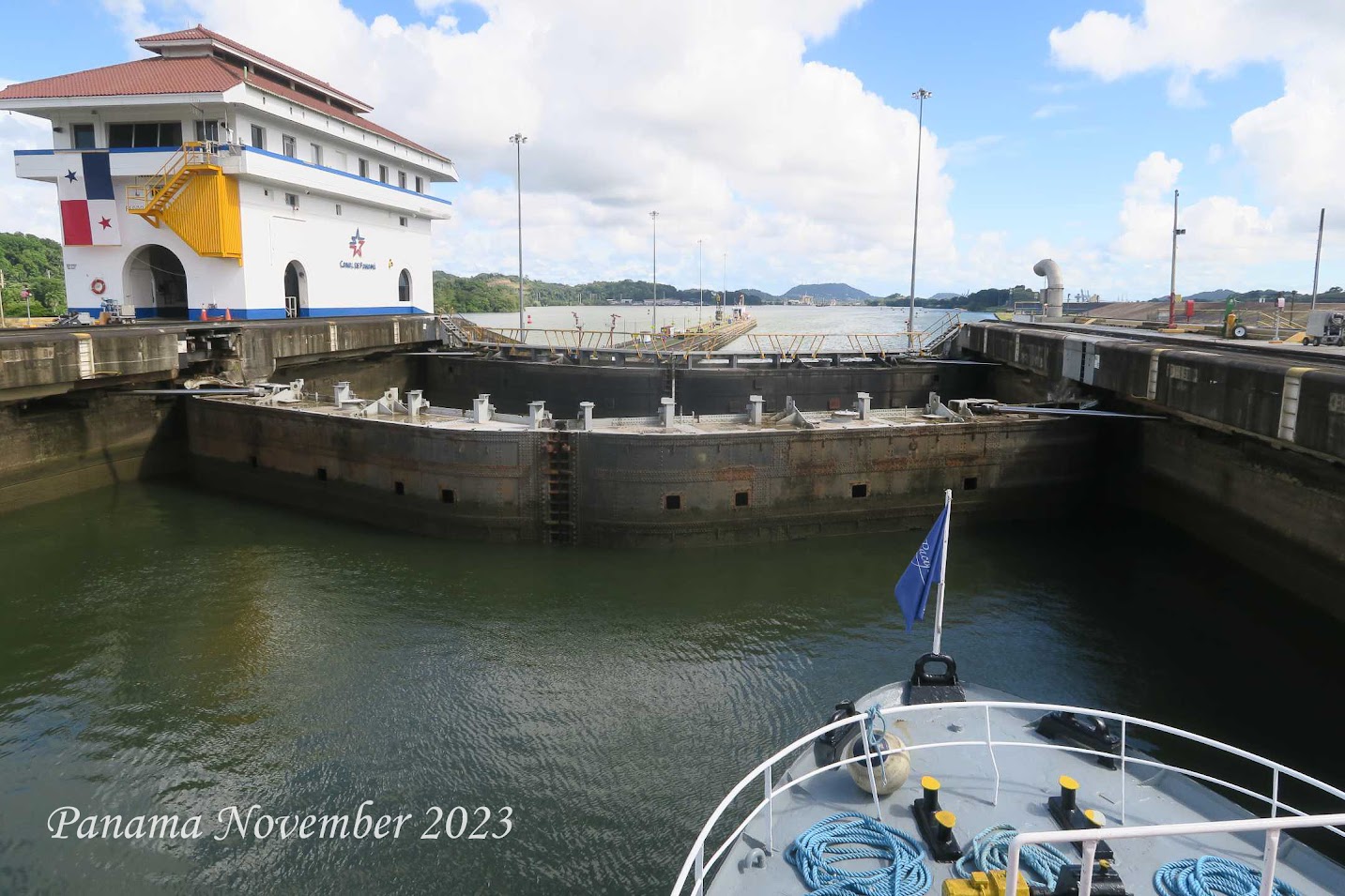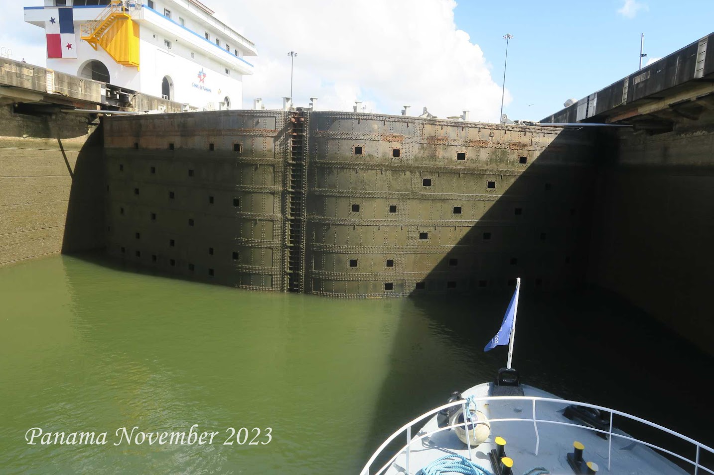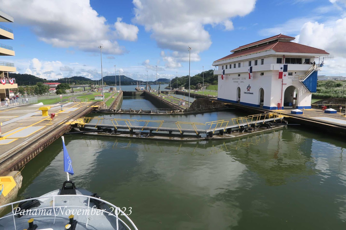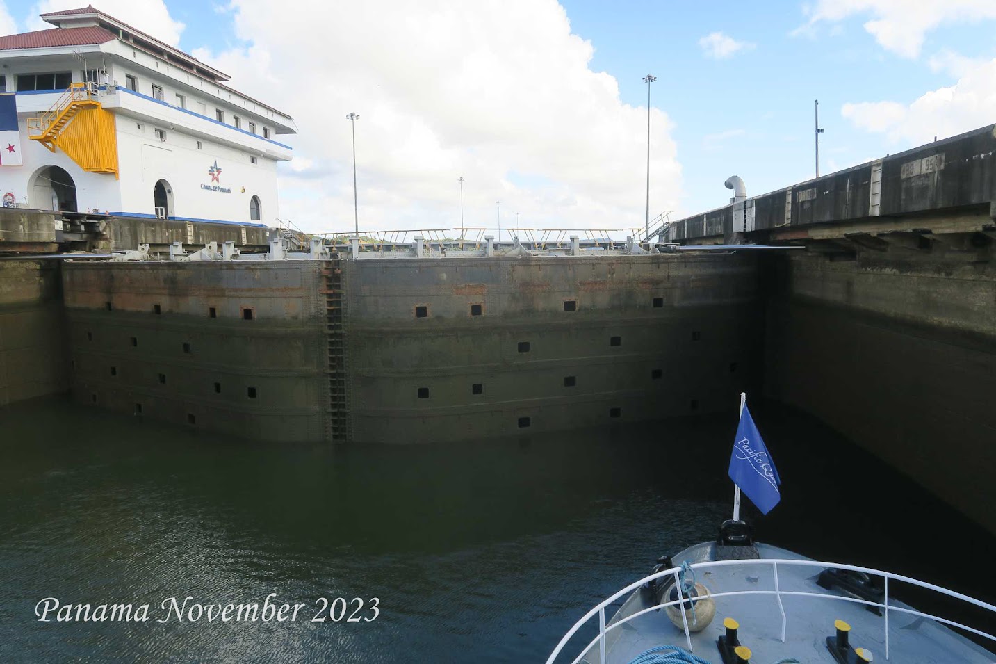 Instead, they built a lock system that would raise or lower the ship, depending on the direction of travel. In our case, we were going from the middle of the canal to the Pacific Ocean, so we needed to descend from the lake's height to sea level.